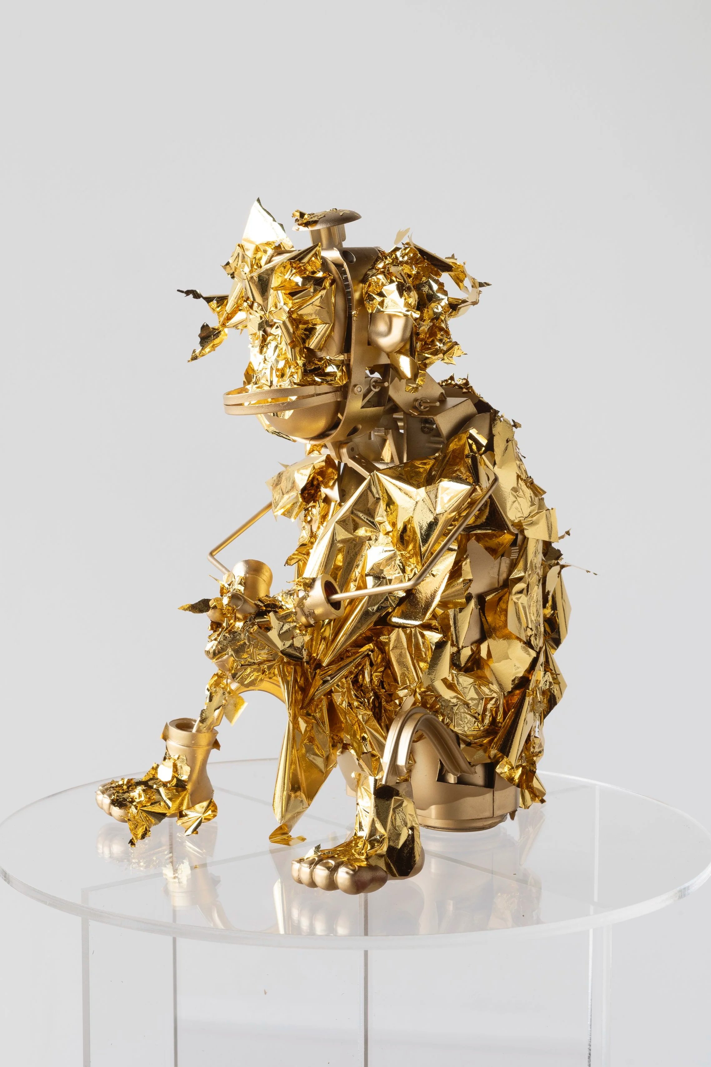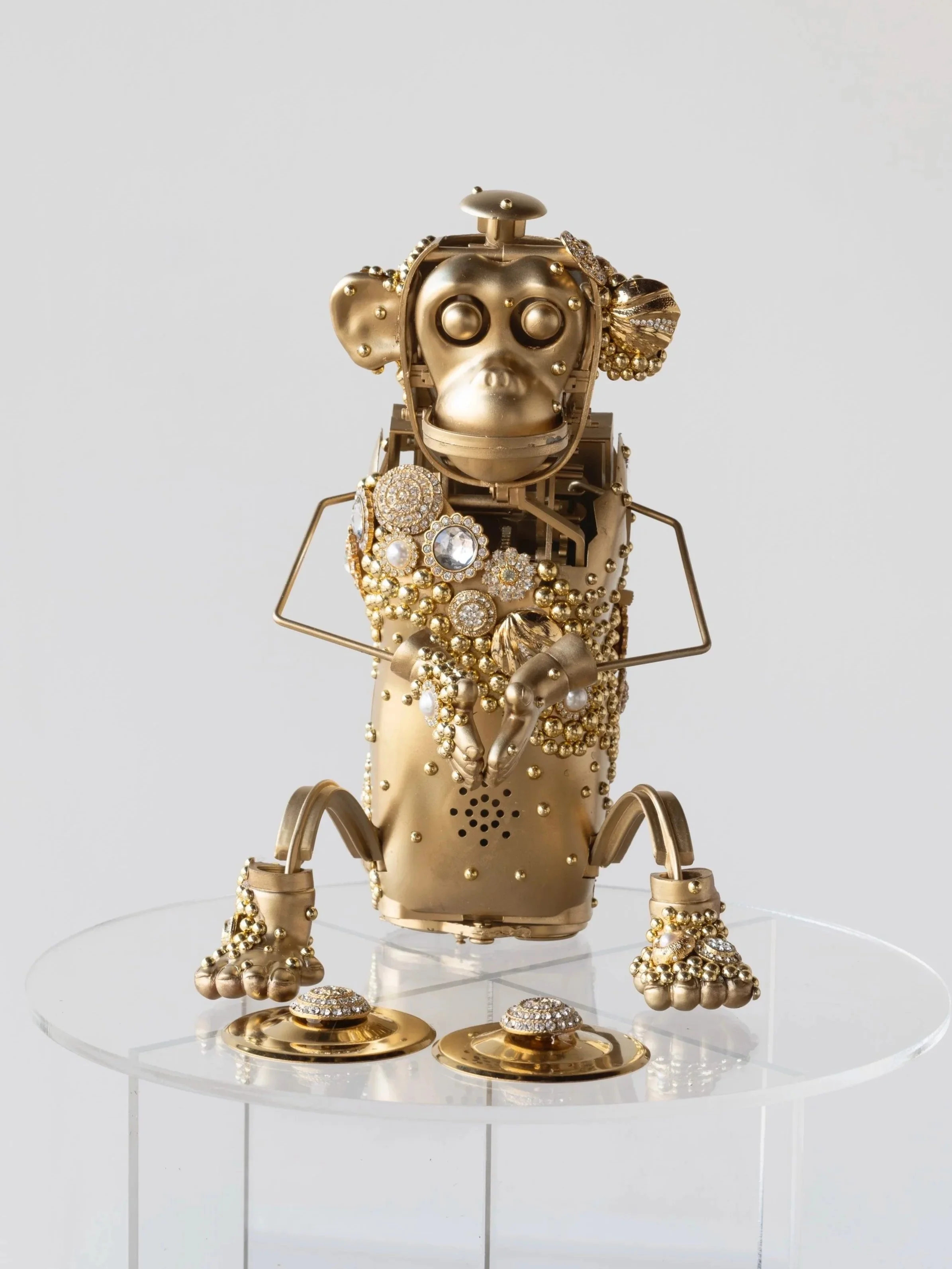 Once a diagnostic tool that shaped the artist’s Deaf identity, the Charlie Chimp hearing test toy is reimagined as a work of resilience. Embellished with crystals, gold chains, and gold leaf, the object becomes a visual symbol examining diagnosis, measurement, and systems of recognition.